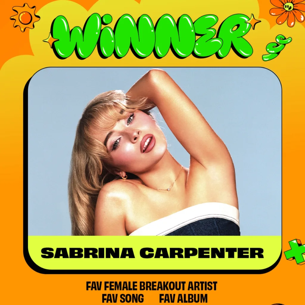 Sabrina Carpenter was the top winner at the 2025 Kids’ Choice Awards, winning three of the show’s signature Orange Blimp trophies: favorite female breakout artist, favorite album for Short n’ Sweet and favorite song for “Taste.” Carpenter’s album, which topped the Billboard 200 for four weeks, won the Grammy for best pop vocal album. “Taste,” a fairly risqué song by Kids’ Choice standards, reached No. 2 on the Billboard Hot 100.
