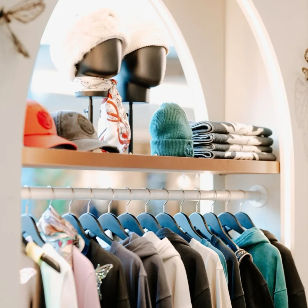 Items on sale in the store include beanies, hoodies, caps, sweatshirts, headphones and earbuds, all featuring Tomorrowland insignia.