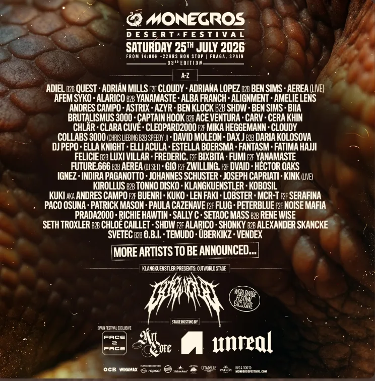 The Monegros Desert Festival 2026 will take place on Saturday, July 25, 2026, in Fraga (Huesca), Spain, with over 20 hours of electronic music. This 33rd edition is notable for the world premiere of Klangkuenstler’s OUTWORLD on a 360º open-air stage, and expects to gather more than 50,000 people in the desert.